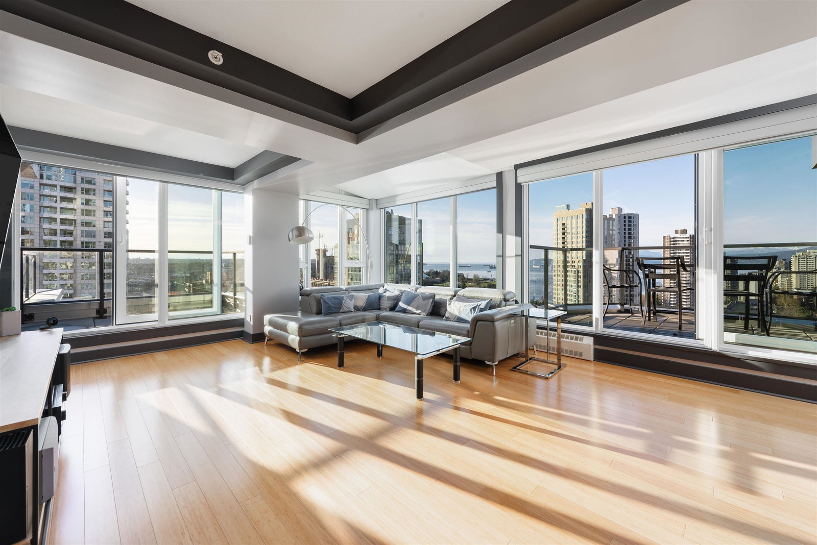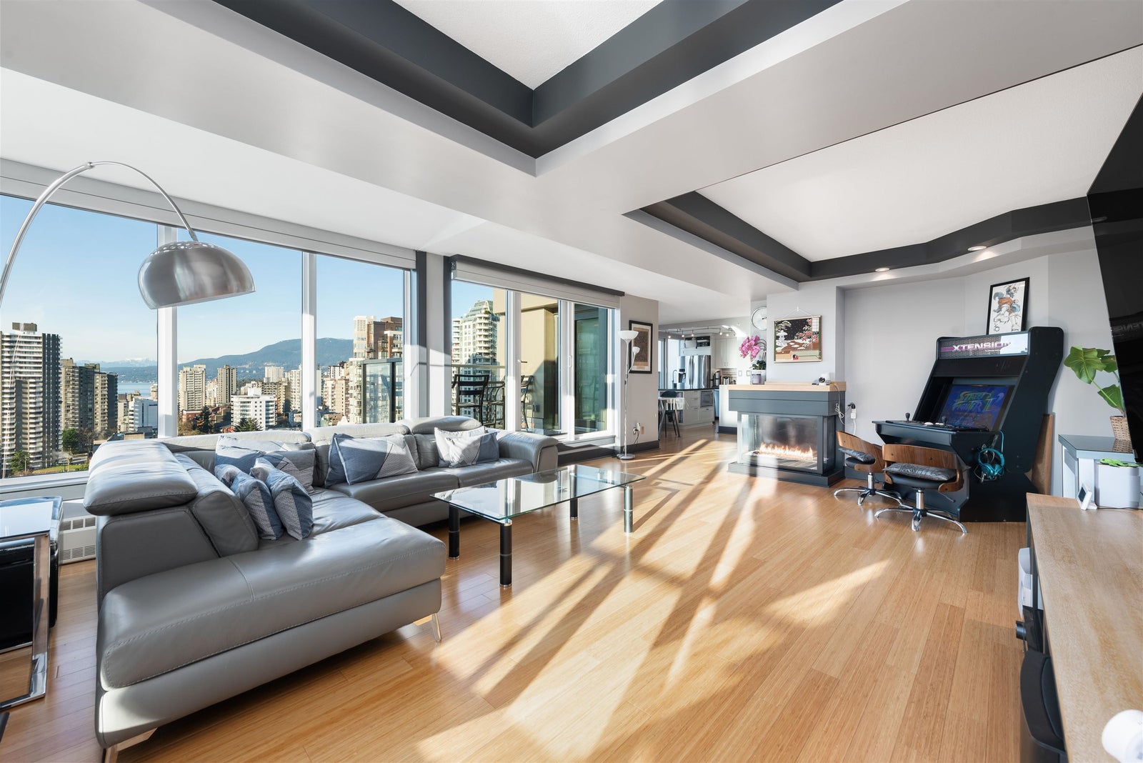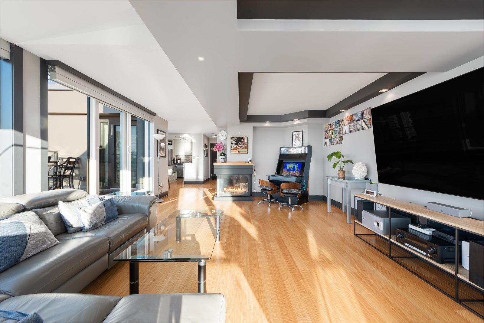 TWO LEVEL CORNER PENTHOUSE. Experience unparalleled luxury in this custom-renovated penthouse with sweeping southwest views of the ocean and mountains. Spanning 1615sqft, this residence offers refined living spaces with extensive updates. Key features include bamboo floors, a modernized kitchen with a new island, and an open-plan living room. Luxurious touches in the bathrooms include Swarovski crystal fixtures, an imported Italian rain shower, alongside practical upgrades,AC units and bespoke cabinetry for enhanced storage. The penthouse also boasts extensive building remediation, updating everything from building envelope, windows, patios, roof, exterior. With 5 balconies, 4 parking stalls and locker. Amenities: pool, hot tub, gym, clubhouse squash/basketball court. Motivated Seller!