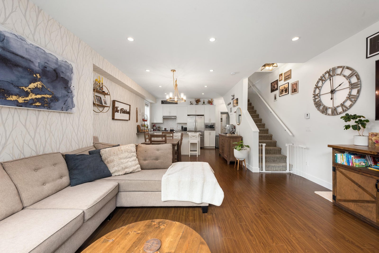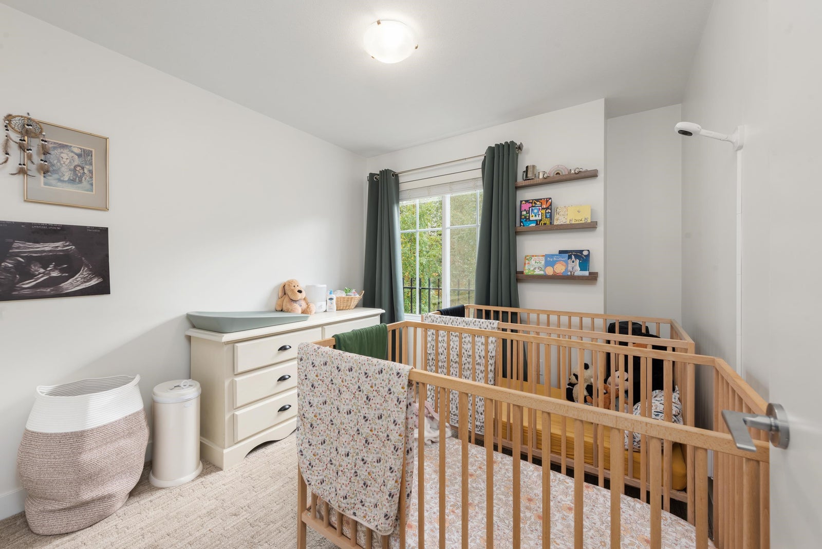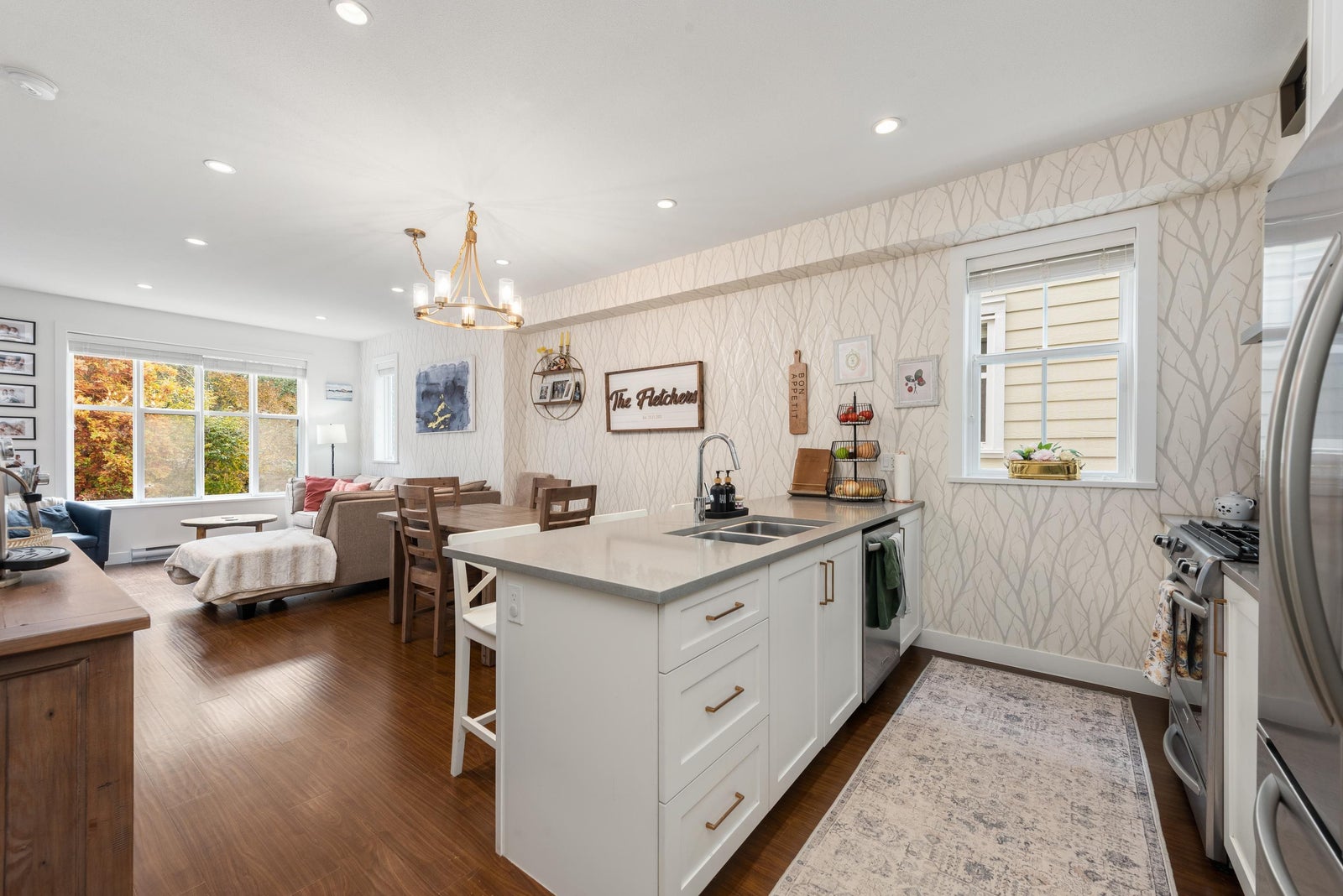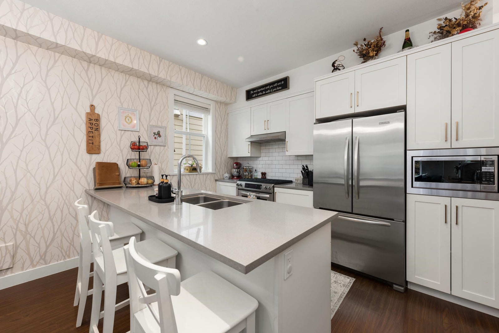 THE WOODS – Stunning END UNIT with serene GREENSPACE VIEWS! Built by GRAMERCY, this distinctive community blends modern design with timeless East Coast charm. Exceptional craftsmanship throughout, featuring 9-ft ceilings, a sleek contemporary kitchen with stainless steel appliances including gas range, quartz countertops, and elegant wide-plank laminate flooring. The BRIGHT & OPEN 3-bedroom plus DEN/OFFICE layout or optional 4th bedroom offers flexible living for any lifestyle. Zoned LIVE/WORK, take advantage of the dedicated studio or office with its own bathroom on the main level. Elevate your evenings on the ROOFTOP PATIO—perfect for entertaining, unwinding, and soaking in the view! Ideally located near shopping, restaurants, and cafés, with quick highway access for easy commuting.