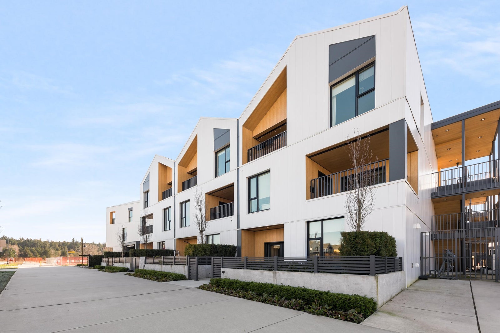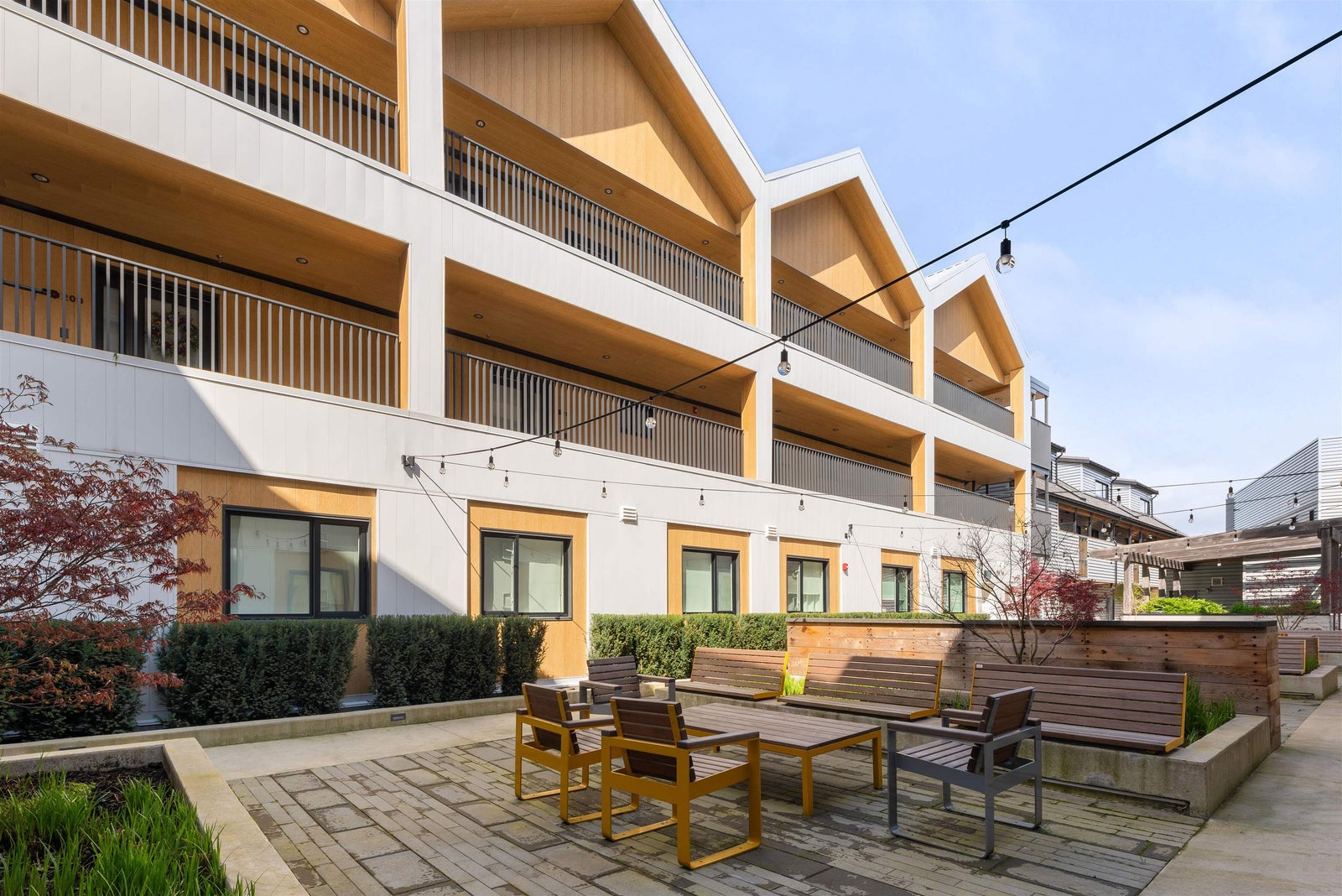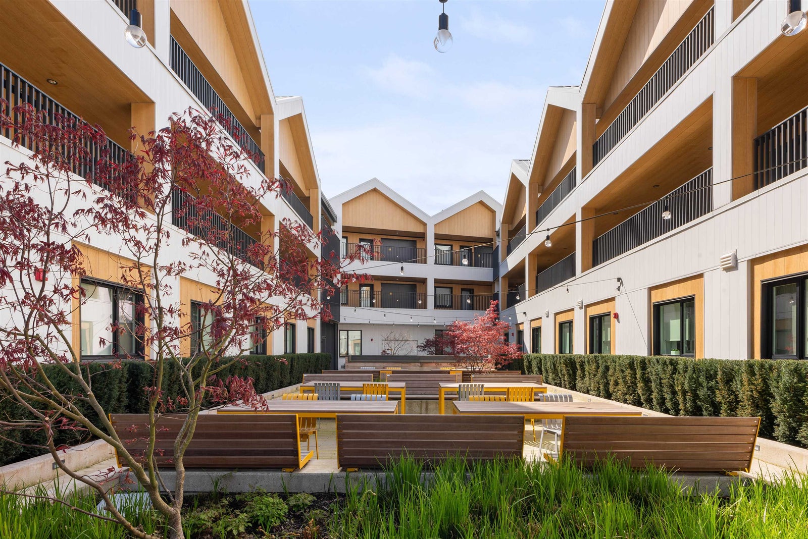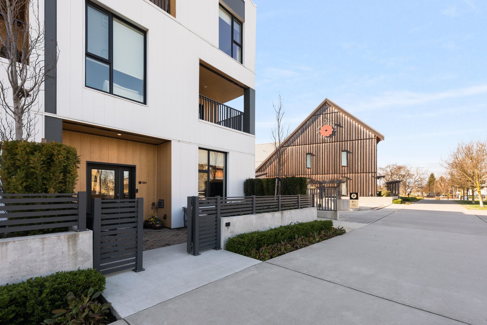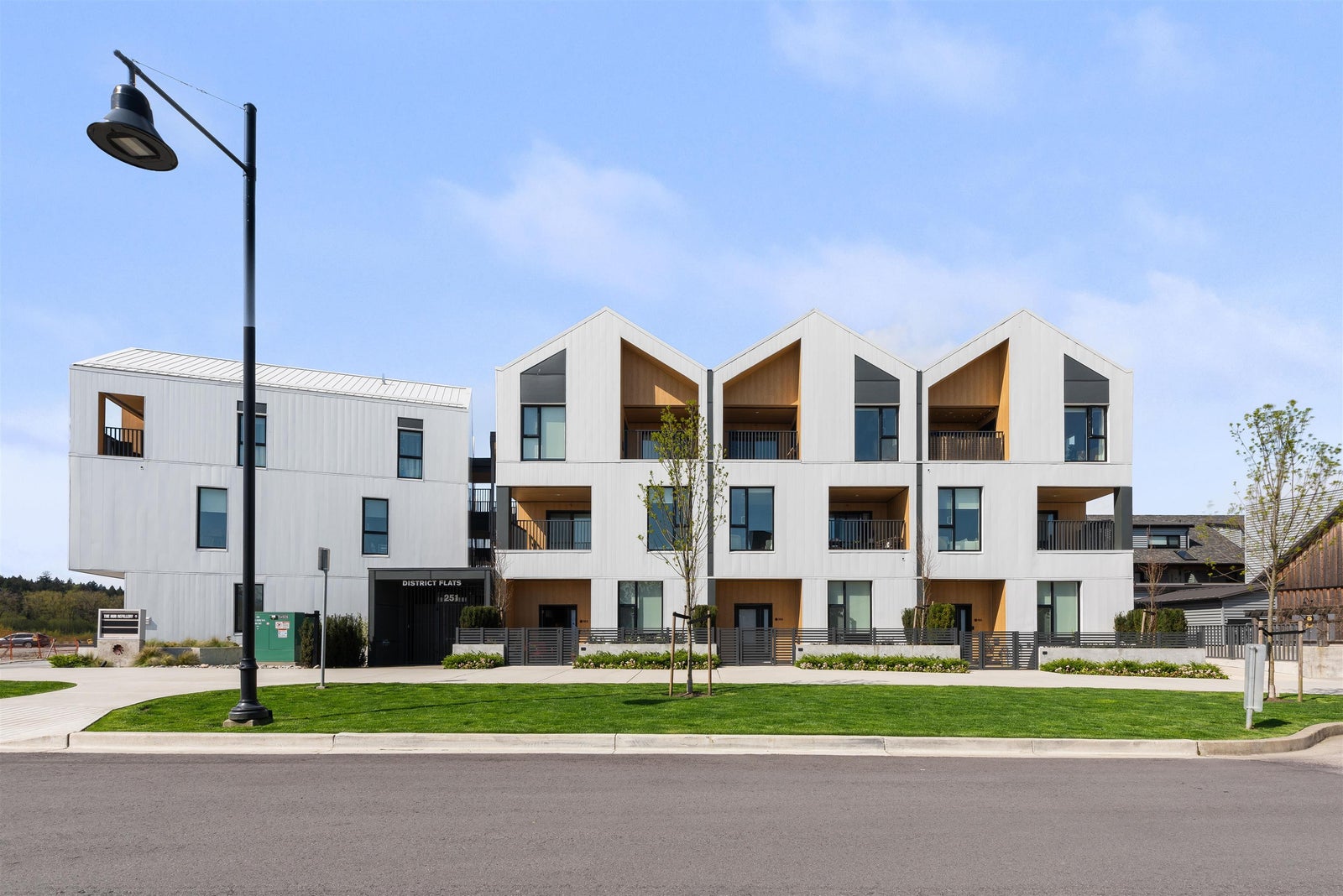 Tucked away on the quiet east side of District Flats, this 2 bed, 2 bath ground-floor corner home offers a rare blend of privacy, natural light, and thoughtful design. With 917 sqft of well-planned space, enjoy overheight ceilings throughout and soaring 12-ft ceilings in the living area, creating an open, airy feel rarely found on the ground level. This east-facing position brings softer morning light, cooler afternoons, and noticeably less foot and vehicle traffic for a more peaceful setting. The open layout flows to a spacious 171sqft patio, perfect for indoor-outdoor living. Steps to Southlands amenities, local shops, and trails, and a short walk to Boundary Bay Beach. Includes 2 underground parking stalls, bike storage, and a 3-year-old building still under warranty.