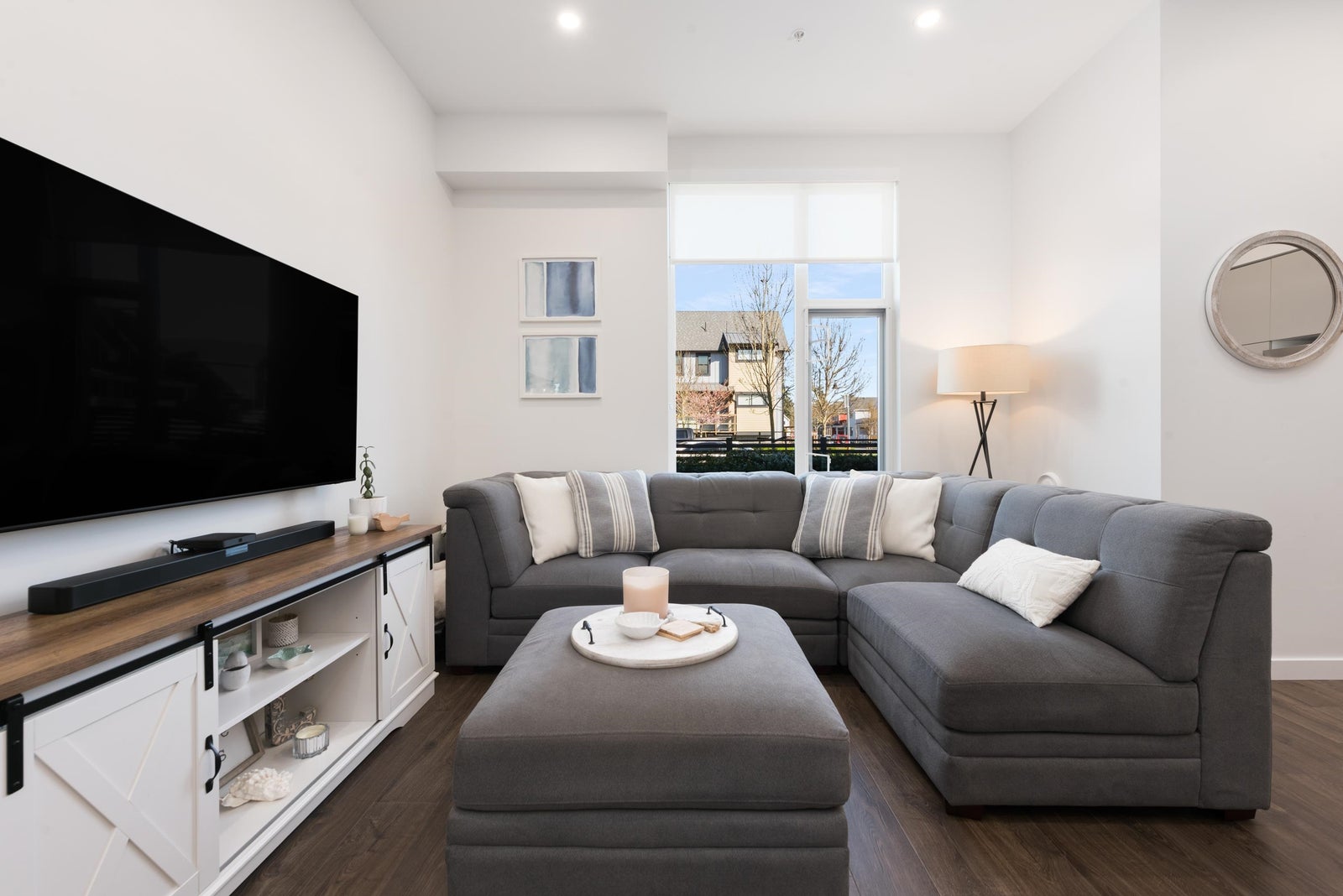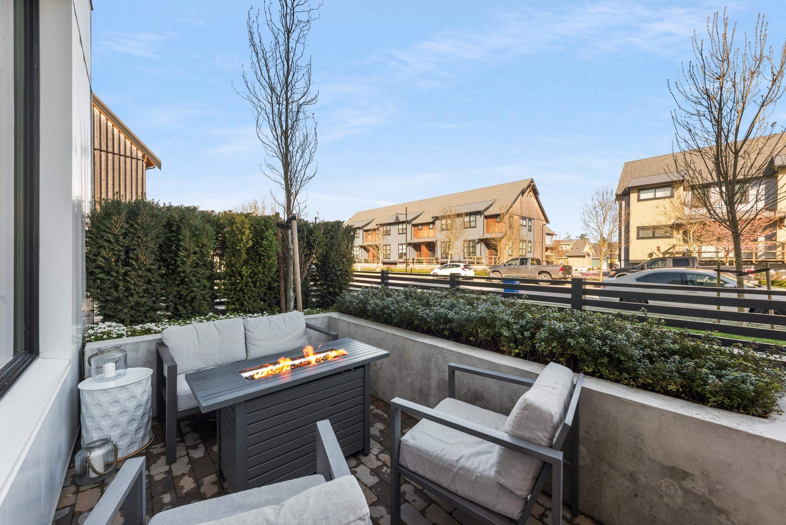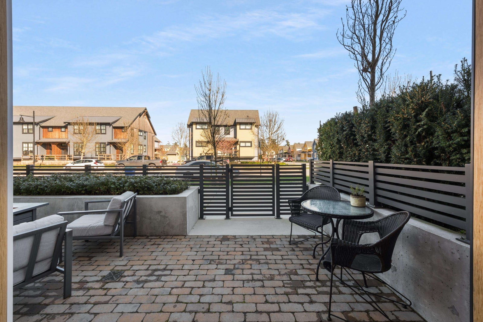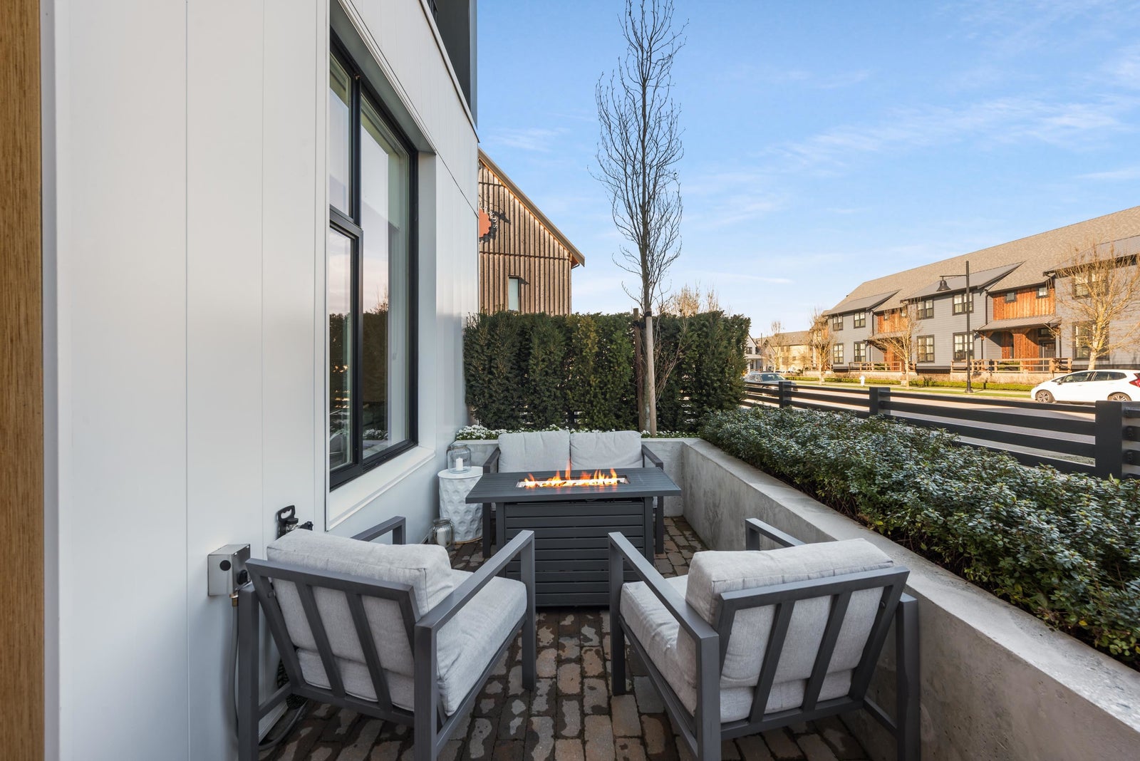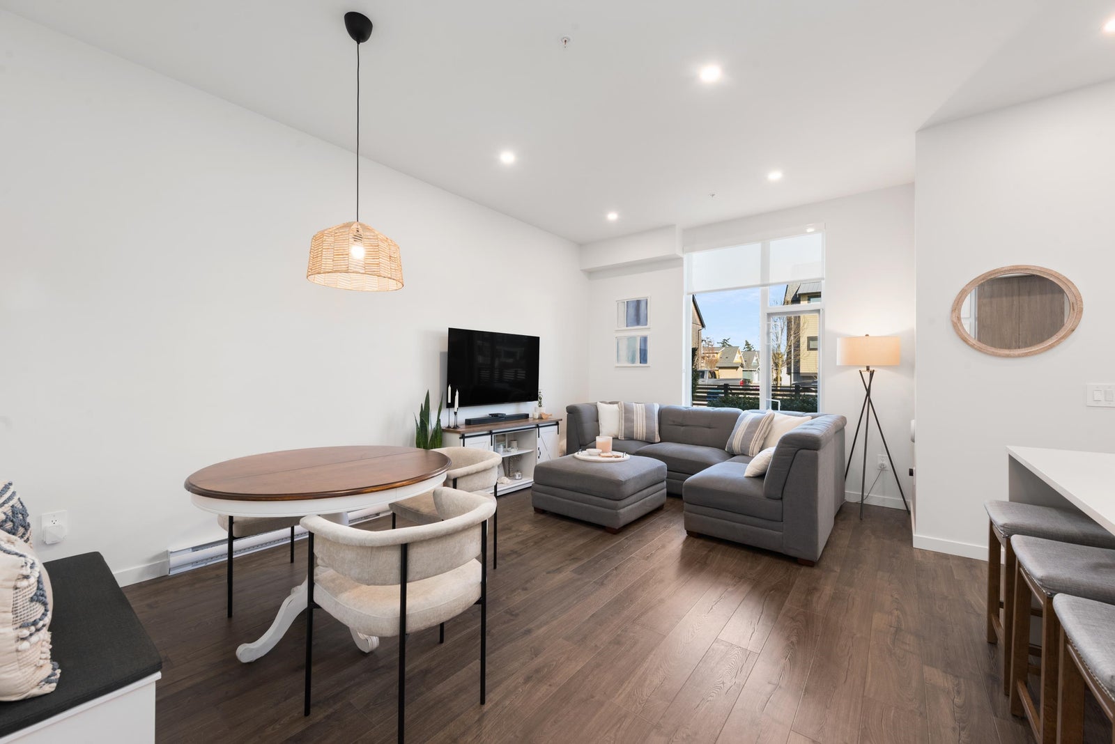 Tucked away on the quiet east side of District Flats, this 2 bed, 2 bath ground-floor corner home offers a rare blend of privacy, natural light, and thoughtful design. With 917 sqft of well-planned space, enjoy overheight ceilings throughout and soaring 12-ft ceilings in the living area, creating an open, airy feel rarely found on the ground level. This east-facing position brings softer morning light, cooler afternoons, and noticeably less foot and vehicle traffic for a more peaceful setting. The open layout flows to a spacious 171sqft patio, perfect for indoor-outdoor living. Steps to Southlands amenities, local shops, and trails, and a short walk to Boundary Bay Beach. Includes 2 underground parking stalls, bike storage, and a 3-year-old building still under warranty.