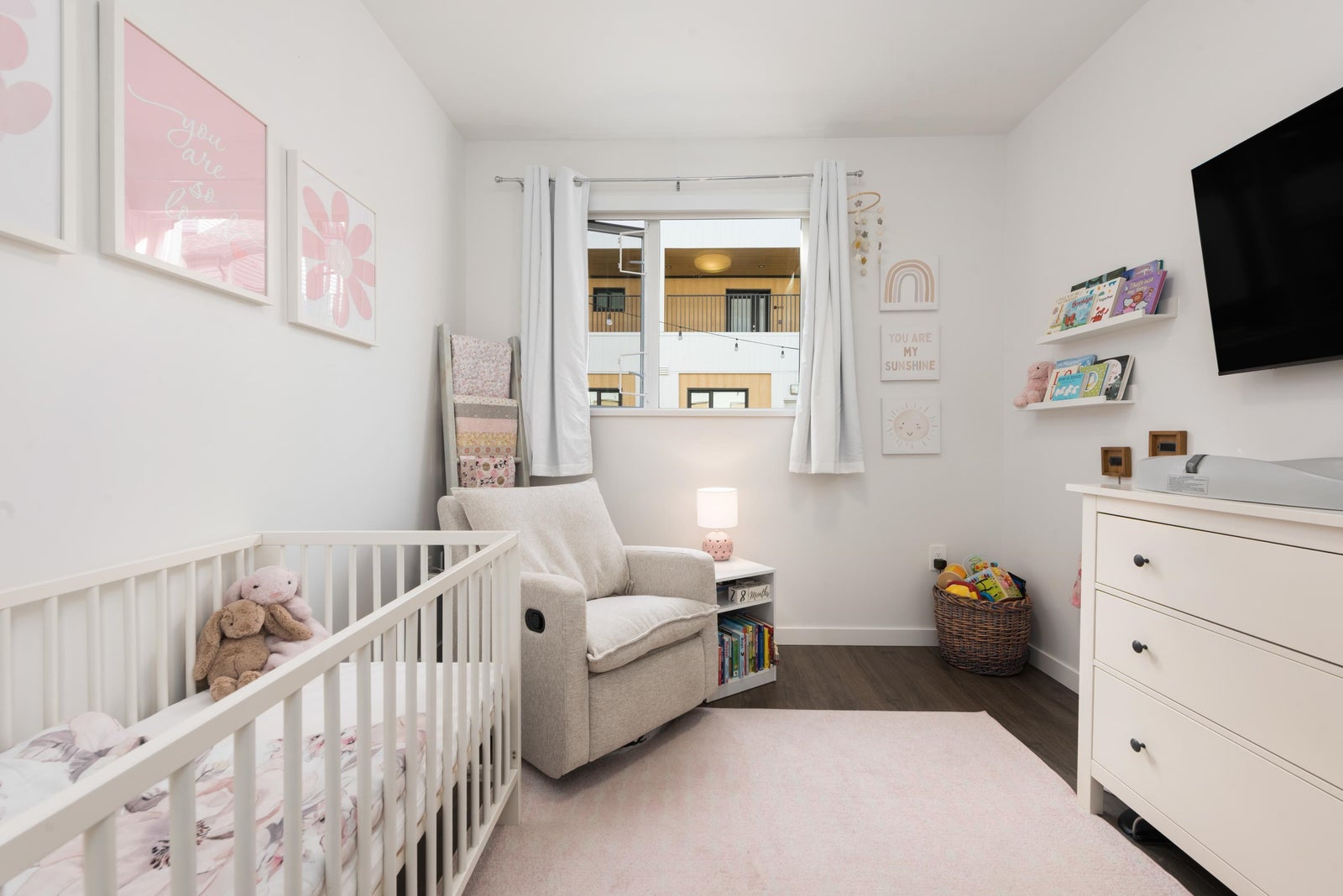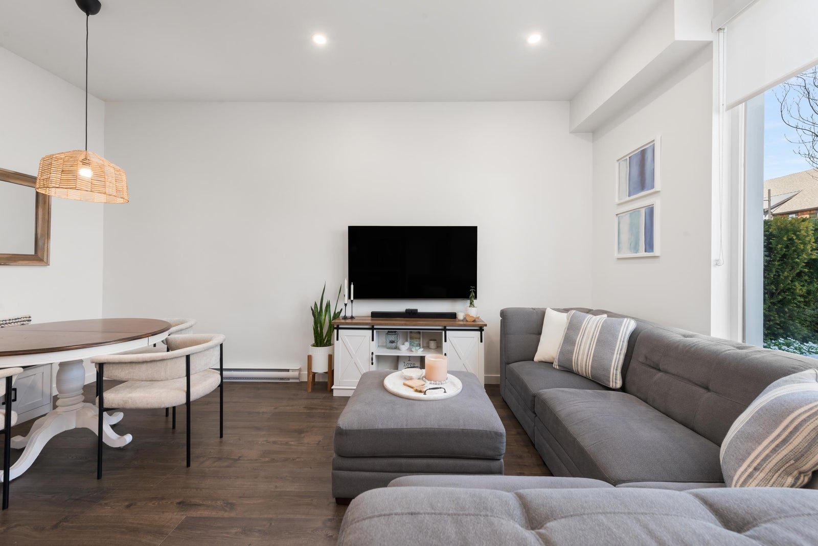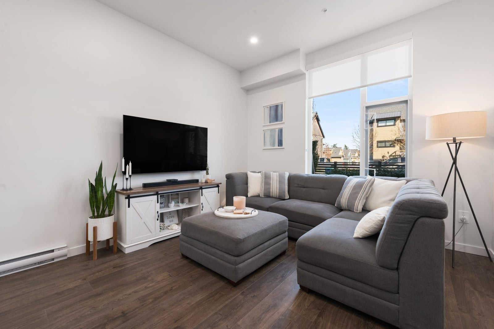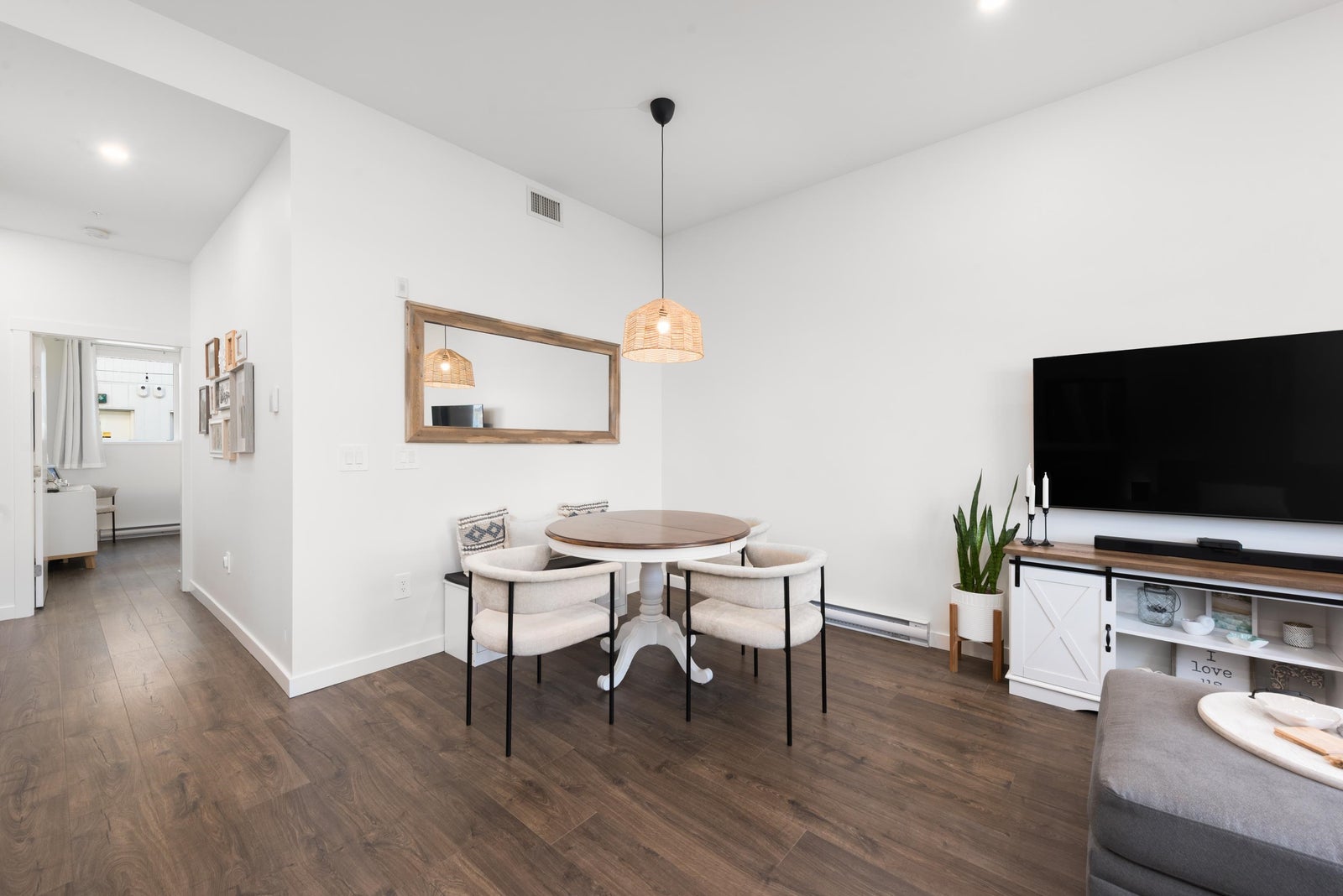 Tucked away on the quiet east side of District Flats, this 2 bed, 2 bath ground-floor corner home offers a rare blend of privacy, natural light, and thoughtful design. With 917 sqft of well-planned space, enjoy overheight ceilings throughout and soaring 12-ft ceilings in the living area, creating an open, airy feel rarely found on the ground level. This east-facing position brings softer morning light, cooler afternoons, and noticeably less foot and vehicle traffic for a more peaceful setting. The open layout flows to a spacious 171sqft patio, perfect for indoor-outdoor living. Steps to Southlands amenities, local shops, and trails, and a short walk to Boundary Bay Beach. Includes 2 underground parking stalls, bike storage, and a 3-year-old building still under warranty.